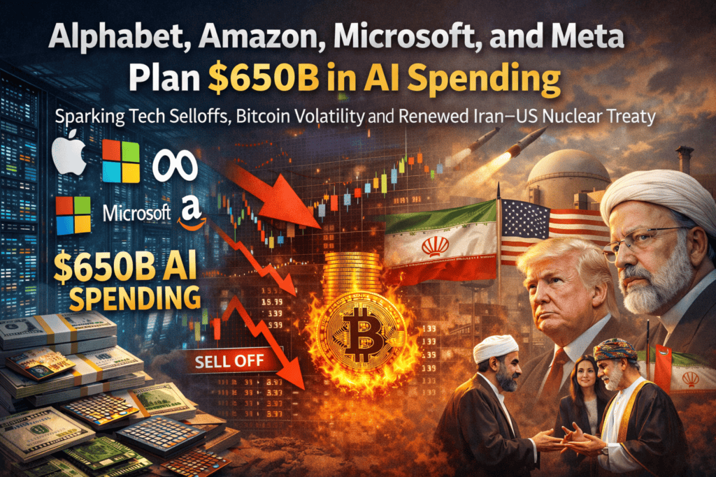 Alphabet, Amazon, Microsoft, and Meta plan $650B in AI spending, sparking tech selloffs, Bitcoin volatility, and renewed Iran–US and nuclear treaty tensions.